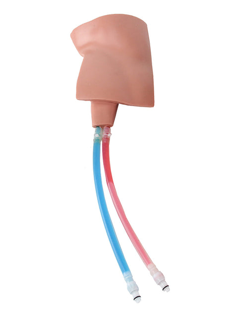 - Two colors of simulated blood differentiate the arterial and venous vessels—provides immediate feedback of unsuccessful cannulation